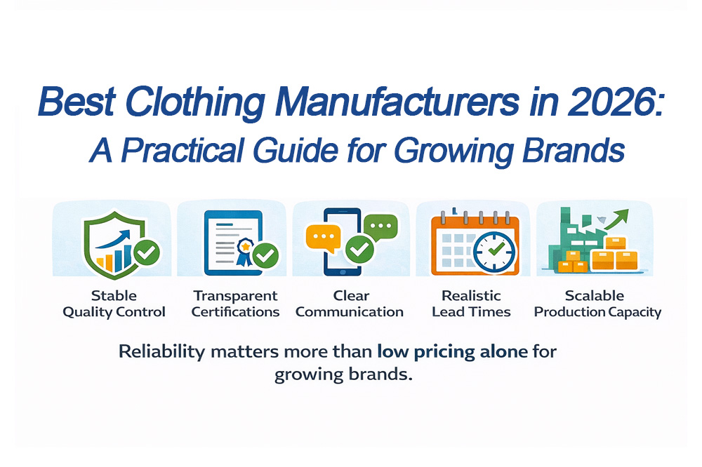 The best clothing manufacturers in 2026 offer stable quality control, transparent certifications, clear communication, realistic lead times, and scalable production capacity. For growing brands, reliability matters more than low pricing alone.